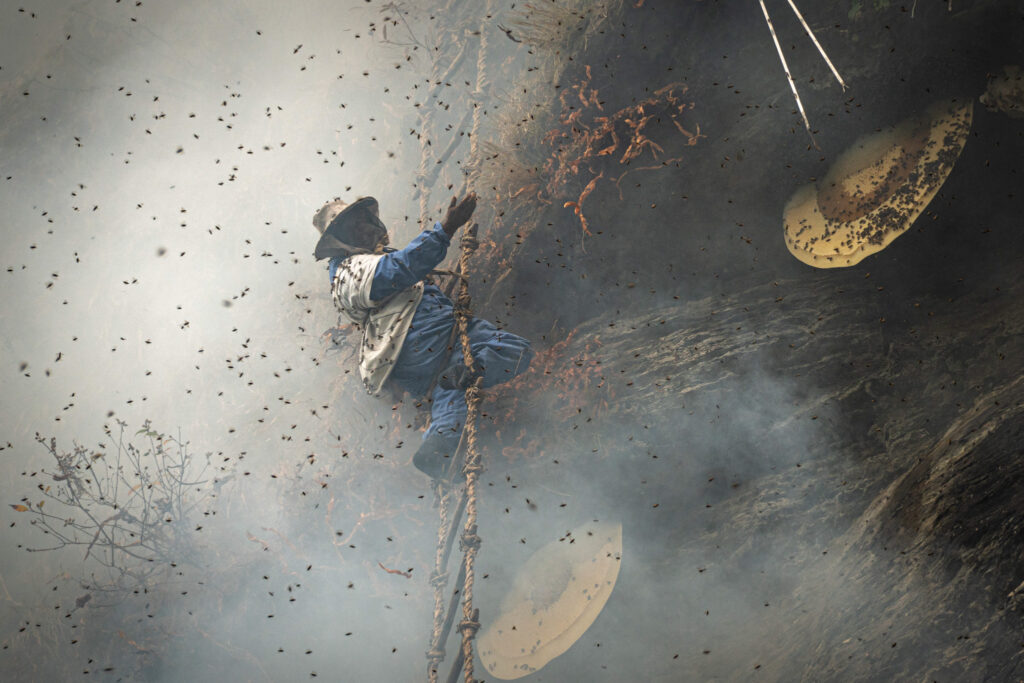 For more than 2,000 years, the men of the Gorong and Magar tribes have been dangling themselves with the help of bamboo ladders and ropes, among the largest bee clouds in the world on the cliffs of the Himalayas.
